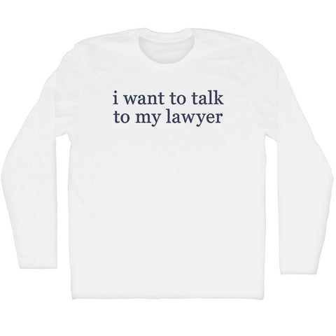 Product Story: I Want To Talk To My Lawyer Rage Font Adult Cotton Long Sleeve T-shirtProduct Description: I Want To Talk To My Lawyer Rage Font Adult Cotton Long Sleeve T-shirt Cotton Buttery Smooth Soft Material Medium Weight Tee Soft Hand Print