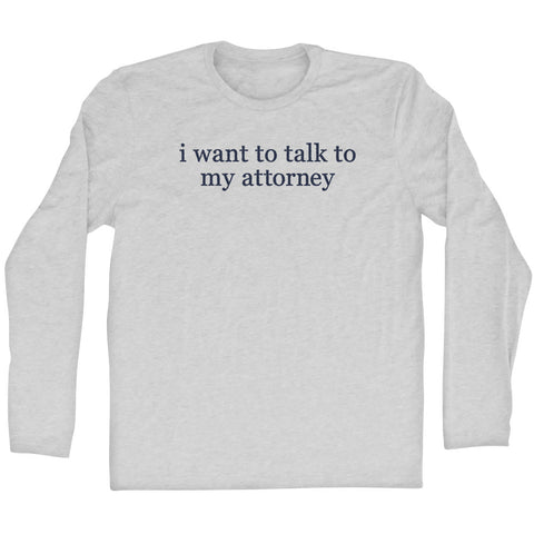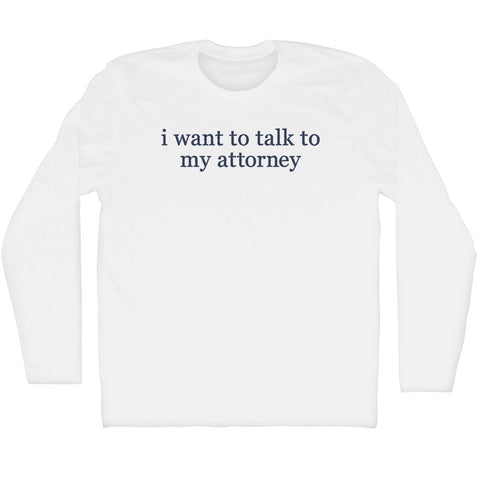 Product Story: I Want To Talk To My Attorney Rage Font Adult Cotton Long Sleeve T-shirtProduct Description: I Want To Talk To My Attorney Rage Font Adult Cotton Long Sleeve T-shirt Cotton Buttery Smooth Soft Material Medium Weight Tee Soft Hand Print