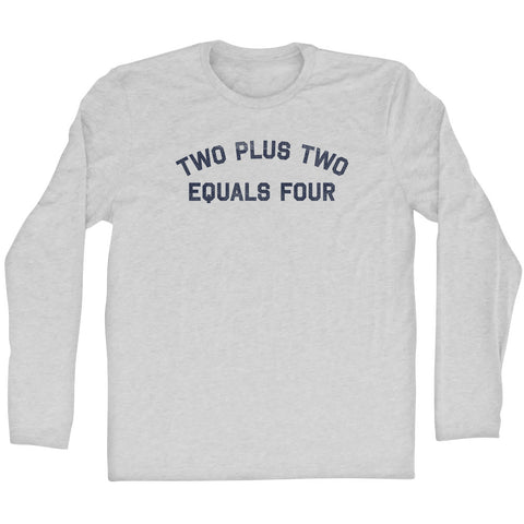 Product Story: Two Plus Two Equals Four Adult Tri-Blend Long Sleeve T-shirtProduct Description: Two Plus Two Equals Four Adult Tri-Blend Long Sleeve T-shirt Tri-Blend (Polyester, Rayon, Cotton) Buttery Smooth Soft Material Medium Weight Tee Soft Hand Print