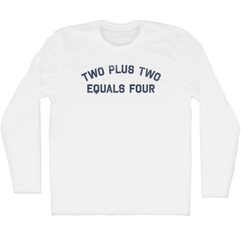 Product Story: Two Plus Two Equals Four Adult Cotton Long Sleeve T-shirtProduct Description: Two Plus Two Equals Four Adult Cotton Long Sleeve T-shirt Cotton Buttery Smooth Soft Material Medium Weight Tee Soft Hand Print