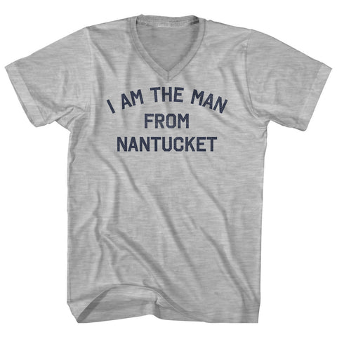Product Story: I Am The Man From Nantucket Adult Cotton V-neck T-shirtProduct Description: I Am The Man From Nantucket Adult Cotton V-neck T-shirt Tri-Blend (Polyester, Rayon, Cotton) Buttery Smooth Soft Material Medium Weight Tee Soft Hand Print