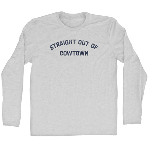 Product Story: Straight Out of Cowtown Adult Tri-Blend Long Sleeve T-shirtProduct Description: Straight Out of Cowtown Adult Tri-Blend Long Sleeve T-shirt Tri-Blend (Polyester, Rayon, Cotton) Buttery Smooth Soft Material Medium Weight Tee Soft Hand Print