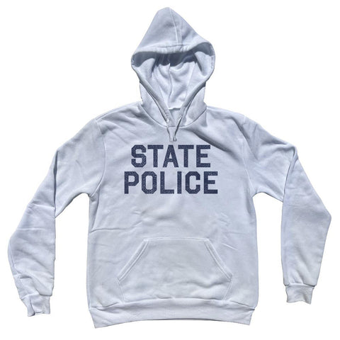 Product Story: State Police Cotton-Poly Blend HoodieProduct Description: State Police Cotton-Poly Blend Hoodie 6.5 oz. Tri-Blend Cozy Soft Material Pre-Shrunk Set-in sleeves Pouch front pocket Ribbed bottom band and sleeve cuffs