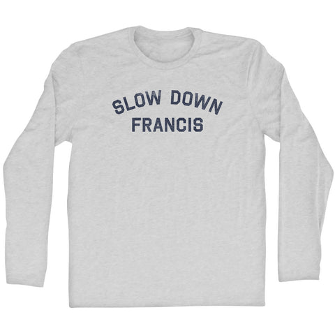 Product Story: Slow Down Francis Adult Tri-Blend Long Sleeve T-shirtProduct Description: Slow Down Francis Adult Tri-Blend Long Sleeve T-shirt Tri-Blend (Polyester, Rayon, Cotton) Buttery Smooth Soft Material Medium Weight Tee Soft Hand Print