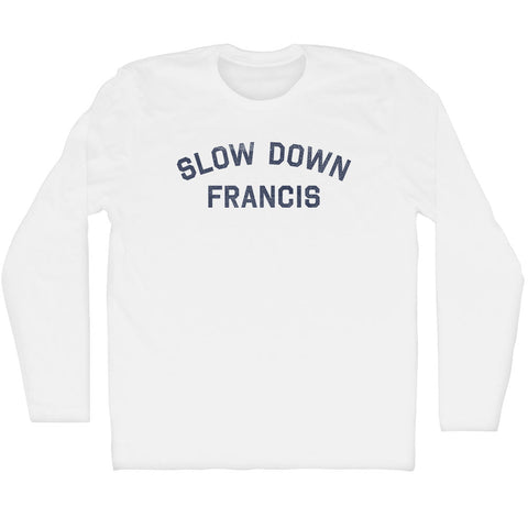 Product Story: Slow Down Francis Adult Cotton Long Sleeve T-shirtProduct Description: Slow Down Francis Adult Cotton Long Sleeve T-shirt Cotton (90% Cotton &10% Polyester) Buttery Smooth Soft Material Medium Weight Tee Soft Hand Print