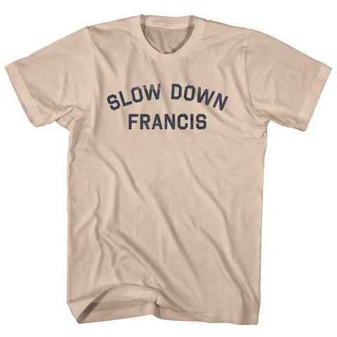 Product Story: Slow Down Francis Adult Cotton T-shirtProduct Description: Slow Down Francis Adult Cotton T-shirt Cotton Buttery Smooth Soft Material Medium Weight Tee Soft Hand Print