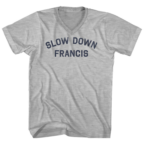 Product Story: Slow Down Francis Adult Cotton V-neck T-shirtProduct Description: Slow Down Francis Adult Cotton V-neck T-shirt Tri-Blend (Polyester, Rayon, Cotton) Buttery Smooth Soft Material Medium Weight Tee Soft Hand Print