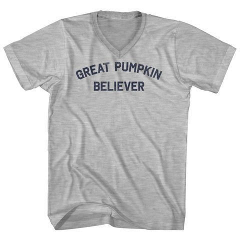 Product Story: Great Pumpkin Believer Adult Cotton V-neck T-shirtProduct Description: Great Pumpkin Believer Adult Cotton V-neck T-shirt Tri-Blend (Polyester, Rayon, Cotton) Buttery Smooth Soft Material Medium Weight Tee Soft Hand Print