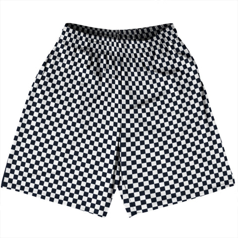 Product Story: Checkerboard Half Inch Blue Navy Almost Black and White Basketball Practice Shorts Made In USAProduct Description: Checkerboard Half Inch Blue Navy Almost Black and White Basketball Practice Shorts Made In USA Basketball Apparel Deep Pockets 100% Micro-Fiber Polyester Made In USA