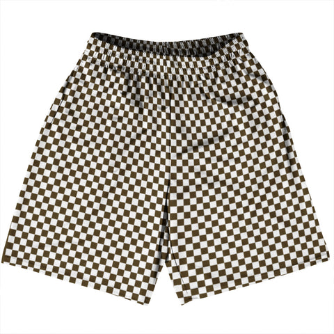 Product Story: Checkerboard Half Inch Brown Dark and White Basketball Practice Shorts Made In USAProduct Description: Checkerboard Half Inch Brown Dark and White Basketball Practice Shorts Made In USA Basketball Apparel Deep Pockets 100% Micro-Fiber Polyester Made In USA