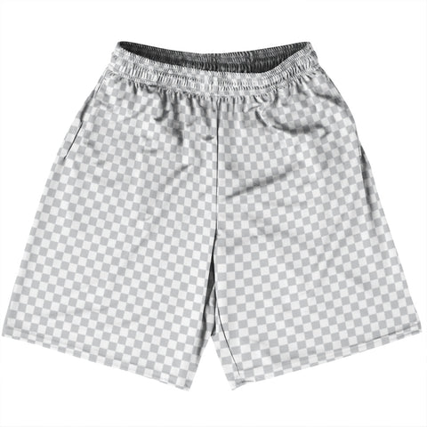 Product Story: Checkerboard Half Inch Grey Medium and White Basketball Practice Shorts Made In USAProduct Description: Checkerboard Half Inch Grey Medium and White Basketball Practice Shorts Made In USA Basketball Apparel Deep Pockets 100% Micro-Fiber Polyester Made In USA