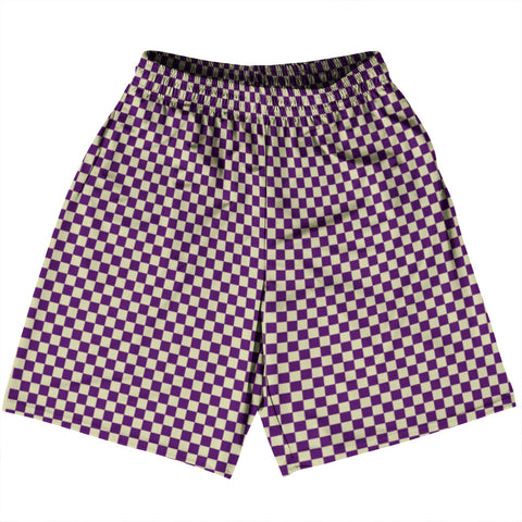 Product Story: Checkerboard Half Inch Purple Lakers and White Basketball Practice Shorts Made In USAProduct Description: Checkerboard Half Inch Purple Lakers and White Basketball Practice Shorts Made In USA Basketball Apparel Deep Pockets 100% Micro-Fiber Polyester Made In USA