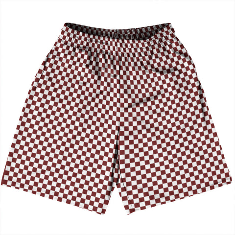 Product Story: Checkerboard Half Inch Red Maroon and White Basketball Practice Shorts Made In USAProduct Description: Checkerboard Half Inch Red Maroon and White Basketball Practice Shorts Made In USA Basketball Apparel Deep Pockets 100% Micro-Fiber Polyester Made In USA