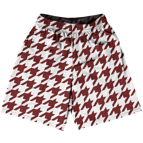 Product Story: Red Maroon And White Houndstooth Basketball Practice Shorts Made In USAProduct Description: Red Maroon And White Houndstooth Basketball Practice Shorts Made In USA Basketball Apparel Deep Pockets 100% Micro-Fiber Polyester Made In USA