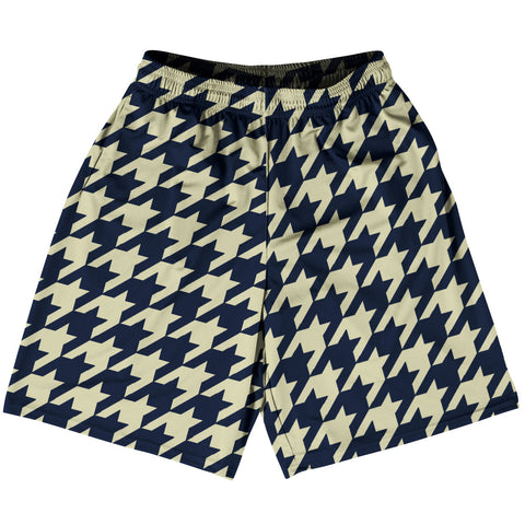 Product Story: Blue Navy And Vegas Gold Houndstooth Basketball Practice Shorts Made In USAProduct Description: Blue Navy And Vegas Gold Houndstooth Basketball Practice Shorts Made In USA Basketball Apparel Deep Pockets 100% Micro-Fiber Polyester Made In USA