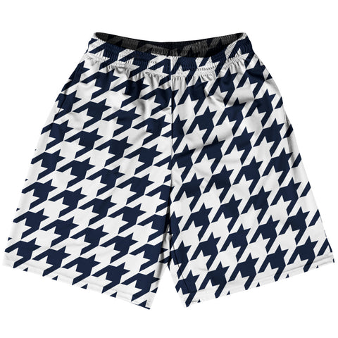 Product Story: Blue Navy And White Houndstooth Basketball Practice Shorts Made In USAProduct Description: Blue Navy And White Houndstooth Basketball Practice Shorts Made In USA Basketball Apparel Deep Pockets 100% Micro-Fiber Polyester Made In USA