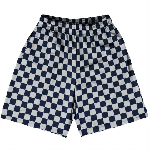 Product Story: Checkerboard 1 Inch Blue Navy And Grey Medium Basketball Practice Shorts Made In USAProduct Description: Checkerboard 1 Inch Blue Navy And Grey Medium Basketball Practice Shorts Made In USA Basketball Apparel Deep Pockets 100% Micro-Fiber Polyester Made In USA