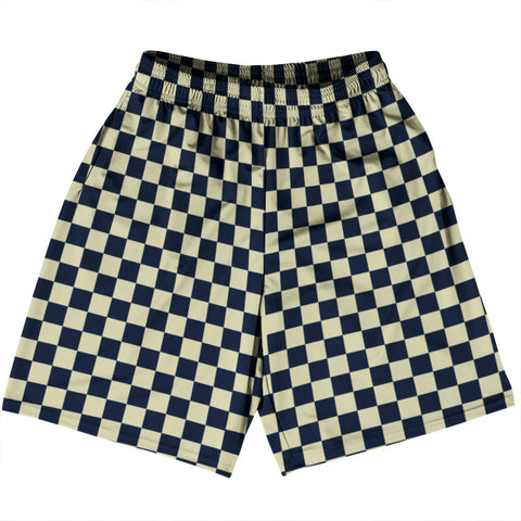Product Story: Checkerboard 1 Inch Blue Navy and Vegas Gold Basketball Practice Shorts Made In USAProduct Description: Checkerboard 1 Inch Blue Navy and Vegas Gold Basketball Practice Shorts Made In USA Basketball Apparel Deep Pockets 100% Micro-Fiber Polyester Made In USA