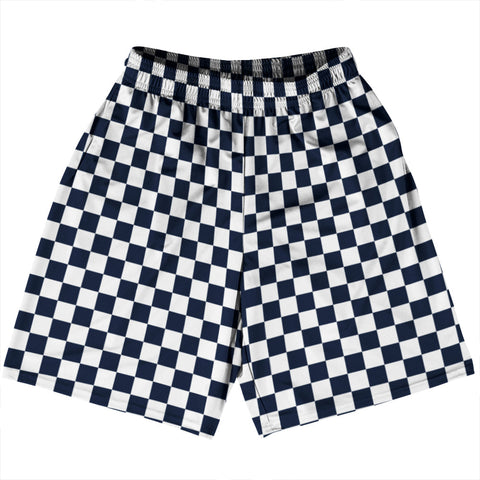 Product Story: Checkerboard 1 Inch Blue Navy and White Basketball Practice Shorts Made In USAProduct Description: Checkerboard 1 Inch Blue Navy and White Basketball Practice Shorts Made In USA Basketball Apparel Deep Pockets 100% Micro-Fiber Polyester Made In USA