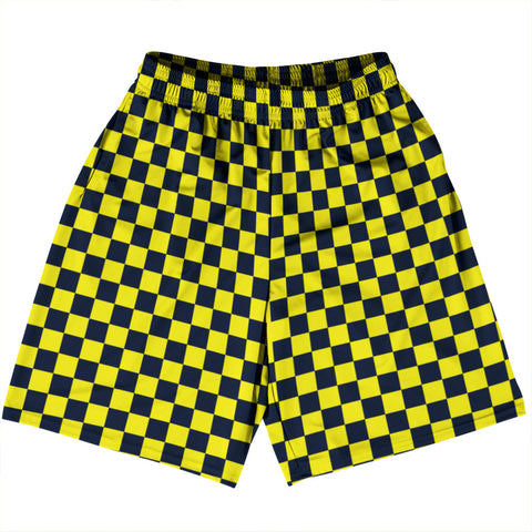 Product Story: Checkerboard 1 Inch Blue Navy and Yellow Canary Basketball Practice Shorts Made In USAProduct Description: Checkerboard 1 Inch Blue Navy and Yellow Canary Basketball Practice Shorts Made In USA Basketball Apparel Deep Pockets 100% Micro-Fiber Polyester Made In USA
