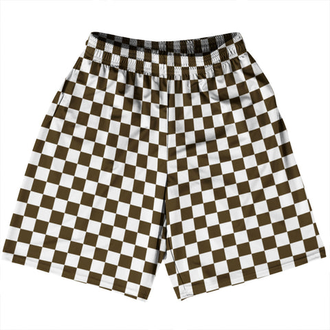 Product Story: Checkerboard 1 Inch Brown Dark and White Basketball Practice Shorts Made In USAProduct Description: Checkerboard 1 Inch Brown Dark and White Basketball Practice Shorts Made In USA Basketball Apparel Deep Pockets 100% Micro-Fiber Polyester Made In USA