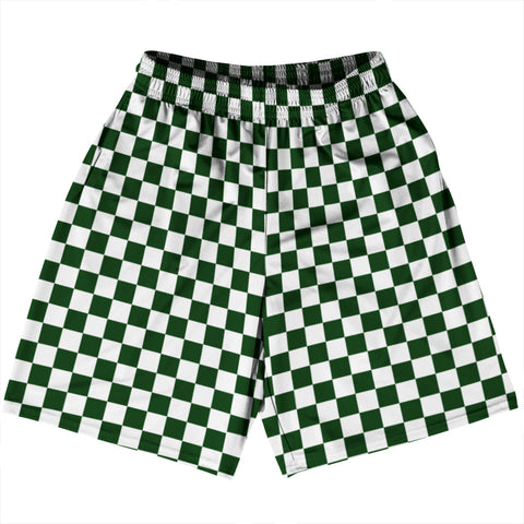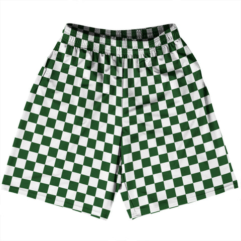 Product Story: Checkerboard 1 Inch Green Forest and White Basketball Practice Shorts Made In USAProduct Description: Checkerboard 1 Inch Green Forest and White Basketball Practice Shorts Made In USA Basketball Apparel Deep Pockets 100% Micro-Fiber Polyester Made In USA