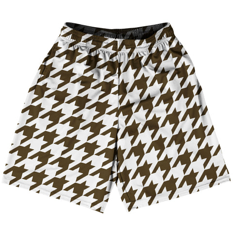 Product Story: Brown Dark And White Houndstooth Basketball Practice Shorts Made In USAProduct Description: Brown Dark And White Houndstooth Basketball Practice Shorts Made In USA Basketball Apparel Deep Pockets 100% Micro-Fiber Polyester Made In USA
