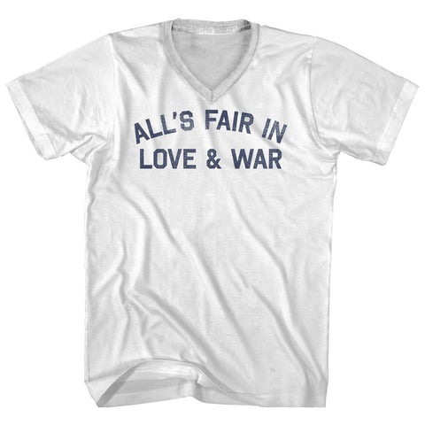 Product Story: All's Fair In Love And War Adult Cotton V-neck T-shirtProduct Description: All's Fair In Love And War Adult Cotton V-neck T-shirt Tri-Blend (Polyester, Rayon, Cotton) Buttery Smooth Soft Material Medium Weight Tee Soft Hand Print