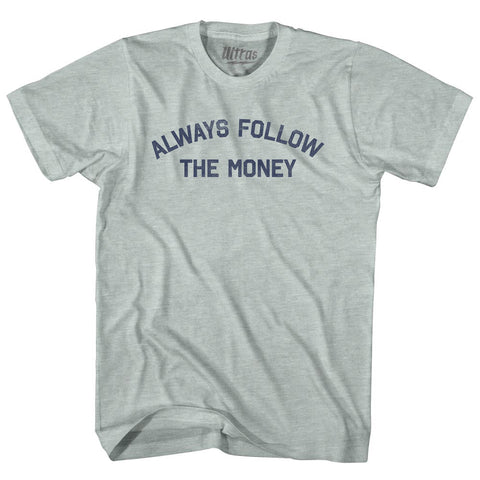 Product Story: Always Follow The Money Adult Tri-Blend T-shirtProduct Description: Always Follow The Money Adult Tri-Blend T-shirt Tri-Blend (Polyester, Rayon, Cotton) Buttery Smooth Soft Material Medium Weight Tee Soft Hand Print
