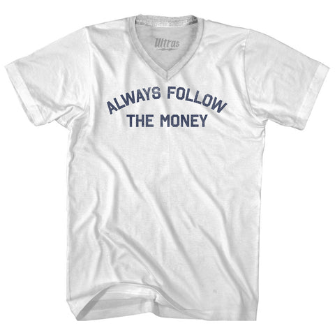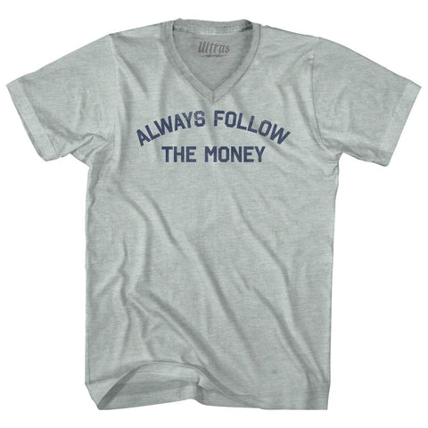 Product Story: Always Follow The Money Adult Tri-Blend V-neck T-shirtProduct Description: Always Follow The Money Adult Tri-Blend V-neck T-shirt Tri-Blend (Polyester, Rayon, Cotton) Buttery Smooth Soft Material Medium Weight Tee Soft Hand Print