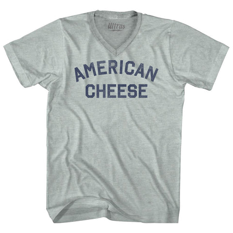 Product Story: American Cheese Adult Tri-Blend V-neck T-shirtProduct Description: American Cheese Adult Tri-Blend V-neck T-shirt Tri-Blend (Polyester, Rayon, Cotton) Buttery Smooth Soft Material Medium Weight Tee Soft Hand Print