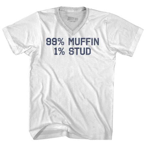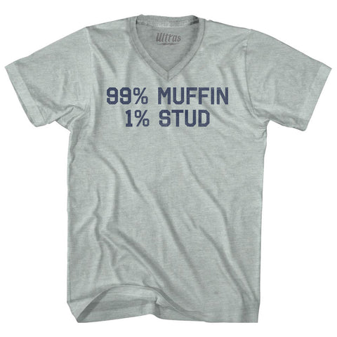 Product Story: 99% Muffin 1% Stud Adult Tri-Blend V-neck T-shirtProduct Description: 99% Muffin 1% Stud Adult Tri-Blend V-neck T-shirt Tri-Blend (Polyester, Rayon, Cotton) Buttery Smooth Soft Material Medium Weight Tee Soft Hand Print
