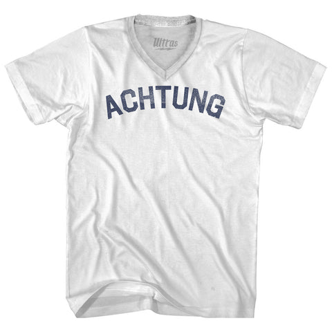 Product Story: Achtung Adult Tri-Blend V-neck T-shirtProduct Description: Achtung Adult Tri-Blend V-neck T-shirt Tri-Blend (Polyester, Rayon, Cotton) Buttery Smooth Soft Material Medium Weight Tee Soft Hand Print