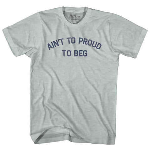 Product Story: Ain't To Proud To Beg Adult Tri-Blend T-shirtProduct Description: Ain't To Proud To Beg Adult Tri-Blend T-shirt Tri-Blend (Polyester, Rayon, Cotton) Buttery Smooth Soft Material Medium Weight Tee Soft Hand Print