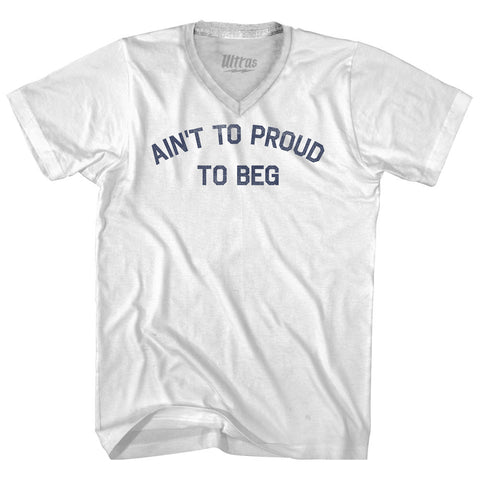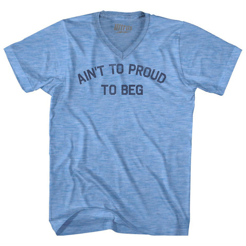 Product Story: Ain't To Proud To Beg Adult Tri-Blend V-neck T-shirtProduct Description: Ain't To Proud To Beg Adult Tri-Blend V-neck T-shirt Tri-Blend (Polyester, Rayon, Cotton) Buttery Smooth Soft Material Medium Weight Tee Soft Hand Print
