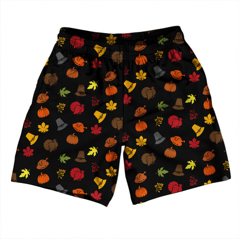 Product Story: Thanksgiving All Over Pattern 5" Swim Shorts Made in USAProduct Description: Thanksgiving All Over Pattern 5" Swim Shorts Made in USA 5" Inseam & 17.5" Tall Swim Trunks Board Shorts Bathing Suits Swim Suits Quick Drying Material Stretch Polyester Elastic Waistband Drawstring Side Pockets Made In USA