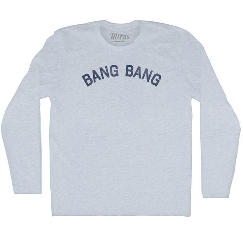 Product Story: Bang Bang Adult Tri-Blend Long Sleeve T-shirtProduct Description: Bang Bang Adult Tri-Blend Long Sleeve T-shirt Tri-Blend (Polyester, Rayon, Cotton) Buttery Smooth Soft Material Medium Weight Tee Soft Hand Print