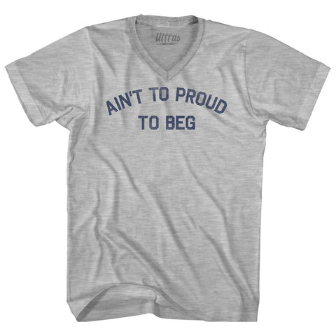 Product Story: Ain't To Proud To Beg Adult Cotton V-neck T-shirtProduct Description: Ain't To Proud To Beg Adult Cotton V-neck T-shirt Cotton Buttery Smooth Soft Material Medium Weight Tee Soft Hand Print