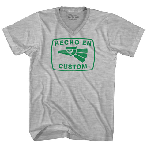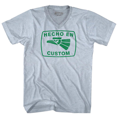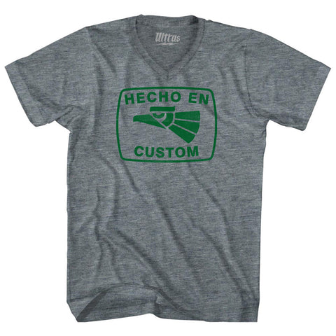 Product Story: Custom Hecho En Adult Tri-Blend V-neck T-shirtProduct Description: Custom Hecho En Adult Tri-Blend V-neck T-shirt Tri-Blend (Polyester, Rayon, Cotton) Buttery Smooth Soft Material Medium Weight Tee Soft Hand Print