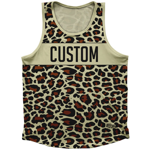 Product Story: Cheetah Pattern Custom Athletic Tank Top Made In USAProduct Description: Cheetah Pattern Custom Athletic Tank Top Made In USA 4 Way Stretch Premium Micro-Fiber Sport Material 100% Polyester Sublimated Print Smooth and Comfortable Moisture Wicking Team Discounts Made in USA