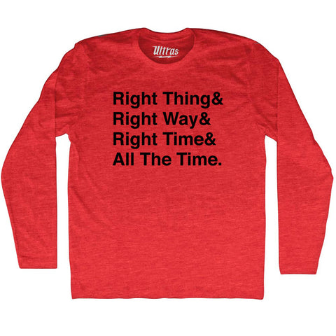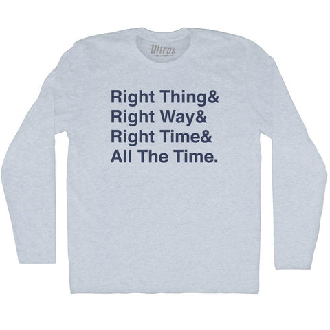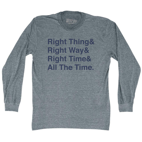 Product Story: Self Disciple Right Thing Right Way Right Time All The Timeamp; Adult Tri-Blend Long Sleeve T-ShirtProduct Description: Self Disciple Right Thing Right Way Right Time All The Timeamp; Adult Tri-Blend Long Sleeve T-Shirt Tri-Blend (Polyester, Rayon, Cotton) Buttery Smooth Soft Material Medium Weight Tee Soft Hand Print
