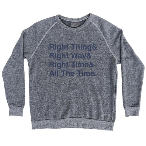 Product Story: Self Disciple Right Thing Right Way Right Time All The Timeamp; Adult Tri-Blend SweatshirtProduct Description: Self Disciple Right Thing Right Way Right Time All The Timeamp; Adult Tri-Blend Sweatshirt Tri-Blend (Polyester, Rayon, Cotton) Buttery Smooth Soft Material Medium Weight Tee Soft Hand Print