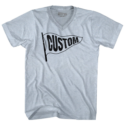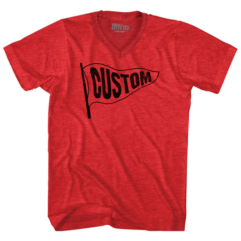 Product Story: Custom Pennant Flag Adult Tri-Blend V-neck T-shirtProduct Description: Custom Pennant Flag Adult Tri-Blend V-neck T-shirt Tri-Blend (Polyester, Rayon, Cotton) Buttery Smooth Soft Material Medium Weight Tee Soft Hand Print