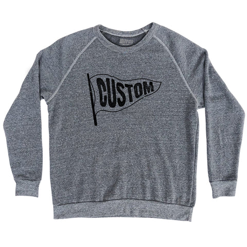 Product Story: Custom Pennant Flag Adult Tri-Blend SweatshirtProduct Description: Custom Pennant Flag Adult Tri-Blend Sweatshirt Tri-Blend (Polyester, Rayon, Cotton) Buttery Smooth Soft Material Medium Weight Tee Soft Hand Print
