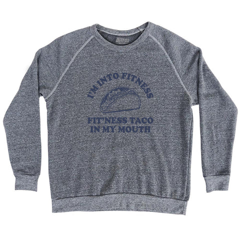 Product Story: I'M Into Fitness Fit'Ness Taco In My Mouth Adult Tri-Blend SweatshirtProduct Description: I'M Into Fitness Fit'Ness Taco In My Mouth Adult Tri-Blend Sweatshirt Cotton Buttery Smooth Soft Material Medium Weight Tee Soft Hand Print