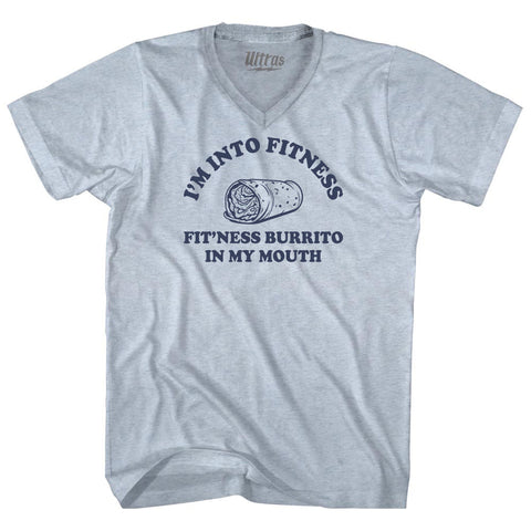 Product Story: I'M Into Fitness Fit'Ness Burrito In My Mouth Adult Tri-Blend V-neck T-shirtProduct Description: I'M Into Fitness Fit'Ness Burrito In My Mouth Adult Tri-Blend V-neck T-shirt Tri-Blend (Polyester, Rayon, Cotton) Buttery Smooth Soft Material Medium Weight Tee Soft Hand Print