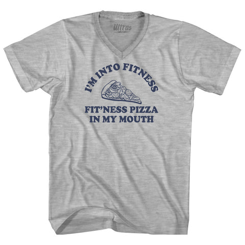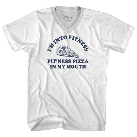 Product Story: I'M Into Fitness Fit'Ness Pizza In My Mouth Adult Cotton V-neck T-shirtProduct Description: I'M Into Fitness Fit'Ness Pizza In My Mouth Adult Cotton V-neck T-shirt Tri-Blend (Polyester, Rayon, Cotton) Buttery Smooth Soft Material Medium Weight Tee Soft Hand Print