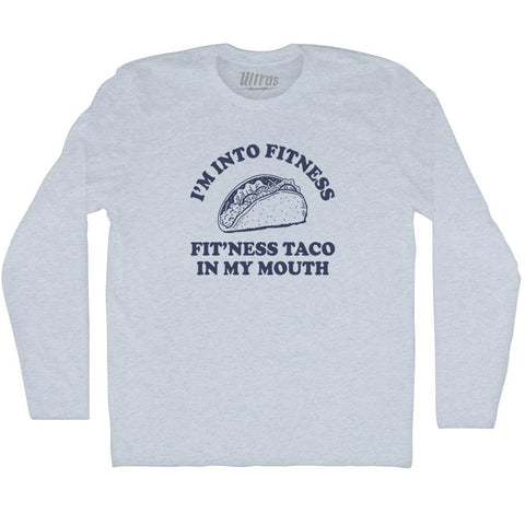 Product Story: I'M Into Fitness Fit'Ness Taco In My Mouth Adult Tri-Blend Long Sleeve T-shirtProduct Description: I'M Into Fitness Fit'Ness Taco In My Mouth Adult Tri-Blend Long Sleeve T-shirt Tri-Blend (Polyester, Rayon, Cotton) Buttery Smooth Soft Material Medium Weight Tee Soft Hand Print