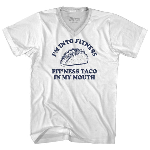 Product Story: I'M Into Fitness Fit'Ness Taco In My Mouth Adult Cotton V-neck T-shirtProduct Description: I'M Into Fitness Fit'Ness Taco In My Mouth Adult Cotton V-neck T-shirt Cotton Buttery Smooth Soft Material Medium Weight Tee Soft Hand Print