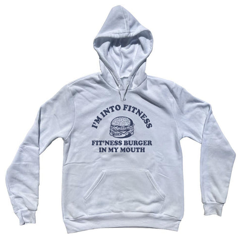 Product Story: I'M Into Fitness Fit'Ness Burger In My Mouth Adult Cotton HoodieProduct Description: I'M Into Fitness Fit'Ness Burger In My Mouth Adult Cotton Hoodie 6.5 oz. Tri-Blend Cozy Soft Material Pre-Shrunk Set-in sleeves Pouch front pocket Ribbed bottom band and sleeve cuffs